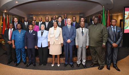1月21日,非洲各國(guó)交通部長(zhǎng)在南非行政首都比勒陀利亞舉行的非洲部長(zhǎng)級(jí)會(huì)議上合影。