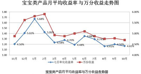 大數(shù)據(jù)君:不要說我沒提醒你。寶寶類產(chǎn)品的高收益神話正在破滅。請看大數(shù)據(jù):2014年,寶寶類產(chǎn)品收益率不斷下降,7日年化收益率由2014年1月的6.5%-7.5%的收益區(qū)間跌至11月份4%-5%的區(qū)間范圍。