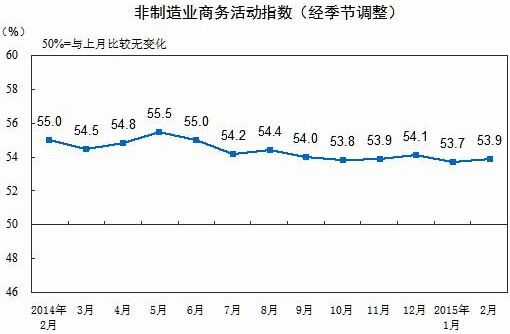 2015年2月,中國非制造業(yè)商務(wù)活動指數(shù)為53.9%,比上月上升0.2個百分點,高于榮枯線3.9個百分點,表明我國非制造業(yè)繼續(xù)保持平穩(wěn)擴張勢頭。