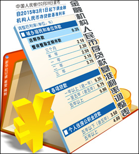 距離上次降息3個月之后,央行再次宣布降息:自2015年3月1日起下調(diào)金融機(jī)構(gòu)人民幣貸款和存款基準(zhǔn)利率。金融機(jī)構(gòu)一年期貸款基準(zhǔn)利率下調(diào)0.25個百分點(diǎn)至5.35%;一年期存款基準(zhǔn)利率下調(diào)0.25個百分點(diǎn)至2.5%,同時結(jié)合推進(jìn)利率市場化改革,將金融機(jī)構(gòu)存款利率浮動區(qū)間的上限由存款基準(zhǔn)利率的1.2倍調(diào)整為1.3倍。