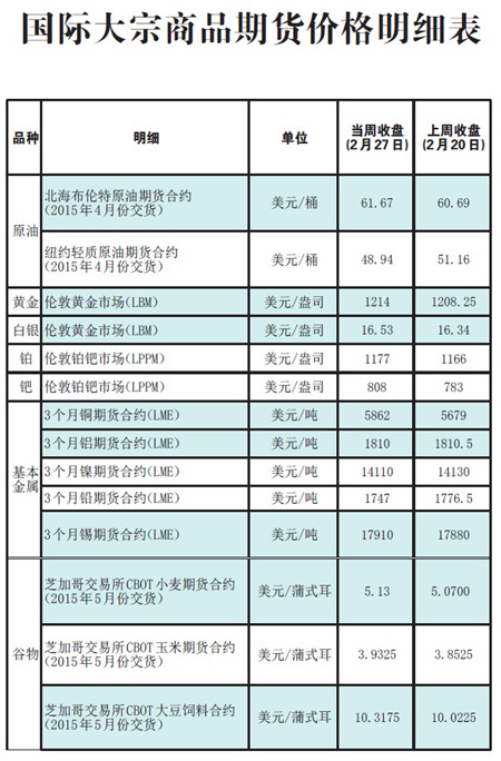 國際大宗商品期貨價格明細(xì)表[2015-3-2]