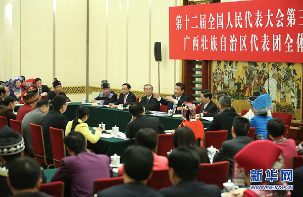 3月8日,中共中央總書(shū)記、國(guó)家主席、中央軍委主席習(xí)近平參加十二屆全國(guó)人大三次會(huì)議廣西代表團(tuán)的審議。 新華社記者 蘭紅光 攝