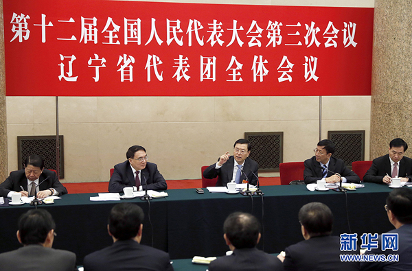 3月8日,中共中央政治局常委、全國人大常委會委員長張德江參加十二屆全國人大三次會議遼寧代表團的審議。 新華社記者 鞠鵬 攝