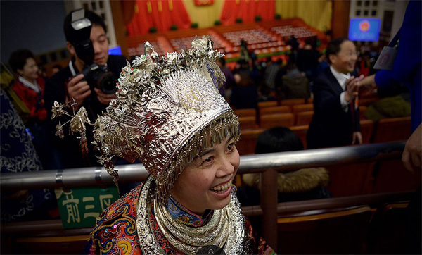 十二屆全國(guó)人民代表大會(huì)第三次會(huì)議在人民大會(huì)堂舉行開(kāi)幕會(huì)。少數(shù)民族代表盛裝出席開(kāi)幕會(huì)。