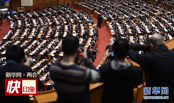 3月10日,全國政協(xié)十二屆三次會(huì)議在北京人民大會(huì)堂舉行第三次全體會(huì)議。這是記者在會(huì)場采訪拍攝。 新華社記者 陳曄華 攝