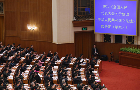 第十二屆全國人民代表大會第三次會議圓滿完成各項(xiàng)議程15日上午在人民大會堂閉幕。大會表決通過關(guān)于修改立法法的決定,國家主席習(xí)近平簽署第20號主席令予以公布。 修改后的立法法將“稅收”專門列出,作為只能制定法律的事項(xiàng),明確“稅種的開征、停征和稅收征收管理的基本制度”只能由法律規(guī)定。 圖為代表們在會上表決。