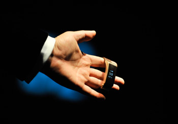 在西班牙巴塞羅那,華為消費(fèi)者BG營(yíng)銷總裁余承東展示智能手環(huán)TalkBand B2。記者 謝海寧/攝 |