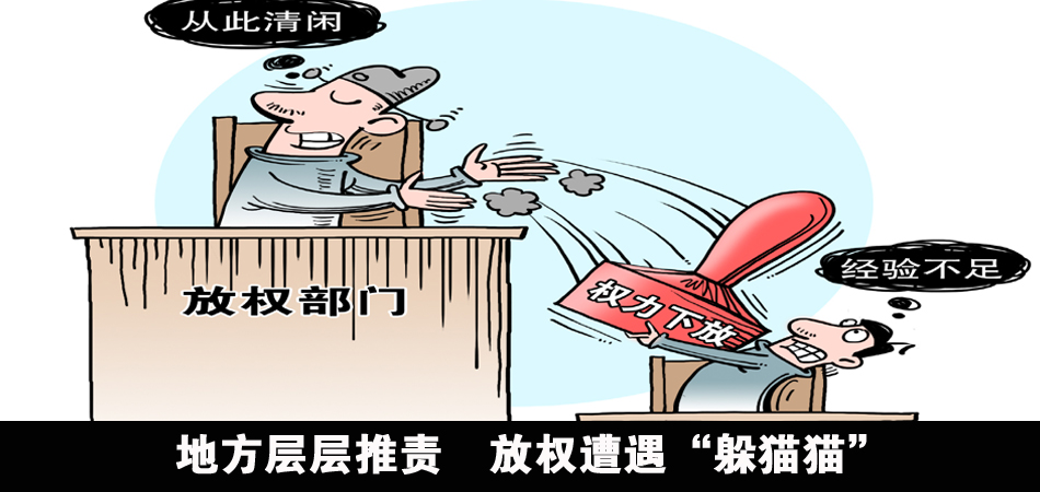 由于怕?lián)?zé),不少從上頭“接權(quán)”的部門辦事人員常以業(yè)務(wù)不熟悉為由,對接手的審批事項拖著不辦,或是跟上級反復(fù)請示,有的還必須要單位一把手簽字才能過關(guān)。部門之間層層“推權(quán)”使得放權(quán)被堵在“最后一公里”上,一些企業(yè)主苦不堪言。