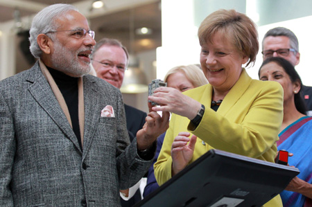 2015年漢諾威工業(yè)博覽會13日正式對公眾開放,本屆展會主題為“融合的工業(yè)-加入網(wǎng)絡(luò)”。印度是此次展會的合作伙伴國。圖為當(dāng)日在德國漢諾威,德國總理默克爾(右)和印度總理莫迪(左)參觀漢諾威工業(yè)博覽會展區(qū)。