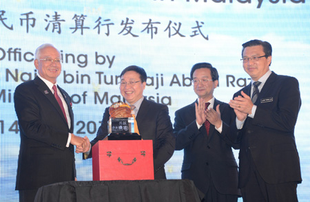 4月14日,在馬來西亞普特拉賈亞,馬來西亞總理納吉布、中國銀行行長陳四清、中國駐馬來西亞大使黃惠康和馬來西亞交通部長廖中萊(從左至右)出席馬來西亞人民幣清算行啟動儀式。 當日,中國銀行馬來西亞吉隆坡人民幣清算行啟動儀式在普特拉賈亞舉行。