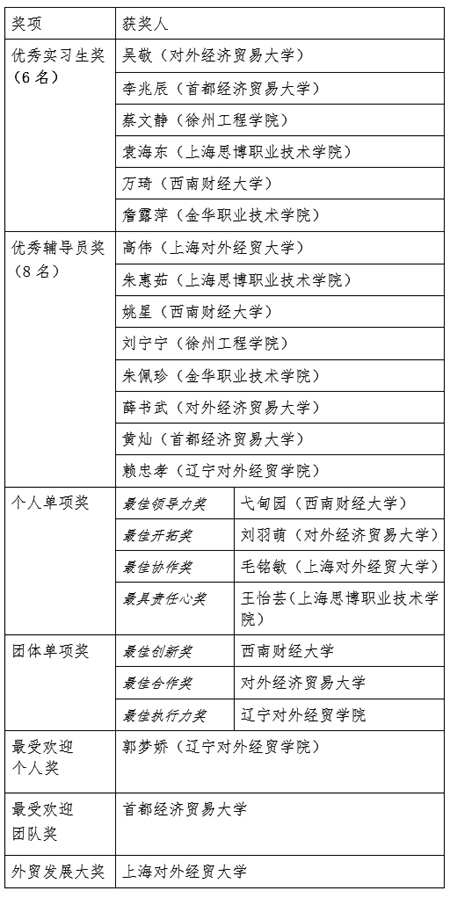 活動還頒發(fā)了“外貿(mào)發(fā)展大獎”、“最佳創(chuàng)新團隊”、“最佳合作團隊”、“最佳領導力獎”、“最佳開拓獎”等2014年度12335商務知識競賽復賽和決賽相關獎項,來自上海對外經(jīng)貿(mào)大學、西南財經(jīng)大學、對外經(jīng)貿(mào)大學等多所大學的學生團隊和個人獲得獎勵。