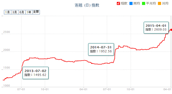 連翹屬于落葉灌木。枝開(kāi)展或下垂,棕色、棕褐色或淡黃褐色,小枝土黃色或灰褐色,略呈四棱形,疏生皮孔,節(jié)間中空,節(jié)部具實(shí)心髓;ㄆ3-4月,果期7-9月。2015年第一季度連翹價(jià)格指數(shù)上漲23.6%,從歷史價(jià)格指數(shù)走勢(shì)來(lái)看,每年連翹價(jià)格上漲期間基本是在7、8月份,此期間主要是由于連翹的果期在7-9月份,受需求拉動(dòng)價(jià)格上漲。但是今年直接在一季度價(jià)格就開(kāi)始出現(xiàn)爬升,此次上漲不同往年的7、8月份,上漲幅度比較緩慢,但周期較長(zhǎng),導(dǎo)致總體漲幅還要高于往期水平。近兩年的連翹價(jià)格指數(shù)走勢(shì)如圖6所示。