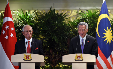 5月5日,新加坡總理李顯龍(右)與馬來西亞總理納吉布在新加坡出席新聞發(fā)布會。 新加坡總理李顯龍5日在第六屆新加坡-馬來西亞領導人非正式會議后的記者會上表示,鑒于新馬高鐵項目的規(guī)模和復雜程度,2020年建成高鐵的計劃“不太現(xiàn)實”。