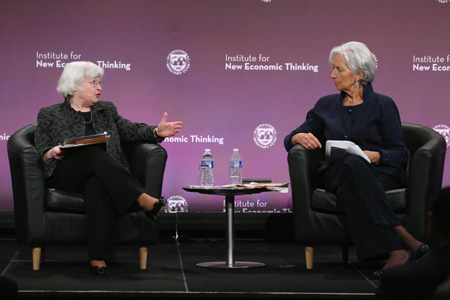 當(dāng)?shù)貢r(shí)間5月6日,美國首都華盛頓,國際貨幣基金組織總裁拉加德(右)和美聯(lián)儲主席耶倫出席對話活動。 耶倫表示,盡管低利率環(huán)境容易導(dǎo)致金融冒險(xiǎn)活動增加,但目前美國金融穩(wěn)定風(fēng)險(xiǎn)仍處于溫和水平,沒有明顯提升。