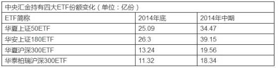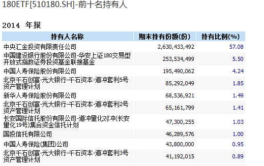 華安上證180ETF2014年年報(bào)顯示,截至去年底,中央?yún)R金有限責(zé)任公司共持有上證180ETF高達(dá)26.3億份,占該ETF總份額的57.08%,為其最大單一持有人。