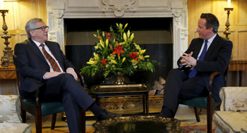 英國首相卡梅倫(右)25日在位于英格蘭白金漢郡的首相鄉(xiāng)間別墅會見歐盟委員會主席容克,討論歐盟改革和英歐關系問題。