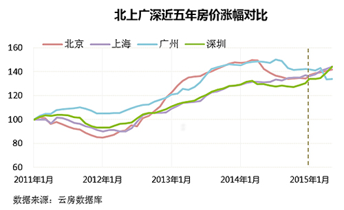 這張圖的精要,就在于讓你站在牛人的肩膀上,一眼看清近五年北上廣深房?jī)r(jià)大勢(shì)?吹搅税,2015年以前的一段時(shí)間內(nèi),深圳房?jī)r(jià)在一線城市中,漲幅算最小的。
