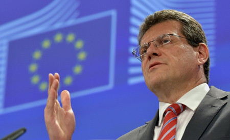 7月1日,在比利時(shí)布魯塞爾,歐盟委員會(huì)副主席馬羅什·謝夫喬維奇召開關(guān)于烏克蘭、俄羅斯和歐盟三方天然氣問題談判的新聞發(fā)布會(huì)。 烏克蘭石油天然氣公司當(dāng)天發(fā)表聲明說,即日起暫停向俄羅斯天然氣工業(yè)股份公司購買天然氣。聲明強(qiáng)調(diào),俄羅斯向歐盟出口的天然氣將繼續(xù)過境烏克蘭進(jìn)行輸送。