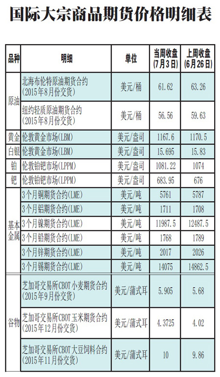 國際大宗商品期貨價(jià)格明細(xì)表[2015-7-6]
