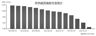 在前期的連續(xù)下跌之下,A股正經(jīng)歷快速的去杠桿過(guò)程。WIND統(tǒng)計(jì)數(shù)據(jù)顯示,截至7月8日收盤(pán),滬深兩市的融資融券余額為14586億元,較前一個(gè)交易日大幅下降了1700億元,自今年6月18日達(dá)到22730億元的最高點(diǎn)后,兩融余額便連續(xù)下滑,短短13個(gè)交易日驟然縮水了8144億元,目前,滬深兩市的融資融券余額已經(jīng)下降到了今年3月底的水平。