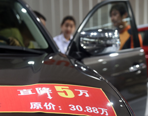 第十二屆中國(guó)(長(zhǎng)春)國(guó)際汽車博覽會(huì)上,降價(jià)優(yōu)惠成為各商家促銷的主要手段,經(jīng)銷商通過(guò)現(xiàn)金優(yōu)惠、貸款免息以及訂車送大禮等優(yōu)惠措施吸引消費(fèi)者。? 記者 林宏/攝