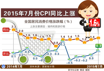 ??? 受國內(nèi)“豬周期”及國際大宗商品價格暴跌影響,我國居民消費價格指數(shù)(CPI)和工業(yè)生產(chǎn)者出廠價格指數(shù)(PPI)走勢進一步分化。國家統(tǒng)計局9日公布數(shù)據(jù)顯示,7月我國CPI同比上漲1.6%,漲幅連續(xù)第二個月擴大,較6月增加0.2個百分點,創(chuàng)下9個月來新高;PPI同比下降5.4%,跌幅連續(xù)第二個月擴大,較6月降低0.6個百分點,連續(xù)第41個月負(fù)增長。