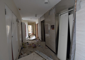8月13日拍攝的爆炸地點(diǎn)附近的萬(wàn)科清水藍(lán)灣小區(qū)受損情況,電梯和門已經(jīng)被毀壞。 新華社記者 岳月偉/攝 |