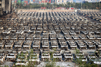 8月13日,在天津海濱爆炸現(xiàn)場(chǎng),數(shù)千輛車輛被燒毀,損失巨大?!⌒氯A社記者 才揚(yáng)/攝 |
