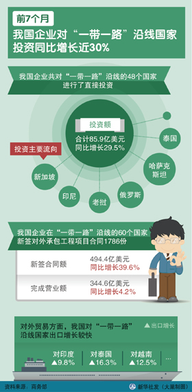 前七個(gè)月,我國(guó)企業(yè)共對(duì)“一帶一路”沿線的48個(gè)國(guó)家進(jìn)行了直接投資,投資額合計(jì)85.9億美元,同比增長(zhǎng)29.5%,投資主要流向新加坡、印尼、老撾、俄羅斯、哈薩克斯坦、泰國(guó)等。