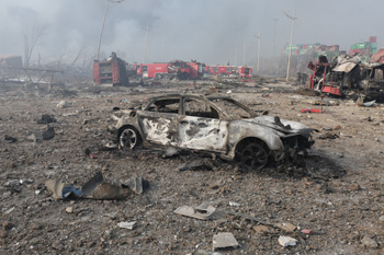 圖為爆炸現(xiàn)場汽車殘骸?!∮浾?金立旺/攝
