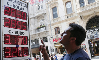 8月18日,在土耳其伊斯坦布爾,一名男子注視匯率顯示屏。土耳其里拉對美元匯率18日再創(chuàng)歷史新低,跌至1美元兌換2.906里拉。自今年初迄今,里拉對美元貶值約20%,為貶值最嚴重的新興市場貨幣之一。同日,土耳其中央銀行決定,維持今年5月以來的利率水平。 新華社/歐新中文 |