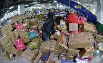 11月12日,在中國郵政寧夏分公司分揀中心,工作人員在將快件包裹分類?!⌒氯A社記者 彭昭之/攝