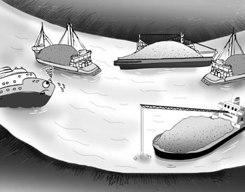 洞庭湖出口處至洞庭湖大橋水道,儼然已成采砂業(yè)的“集貿(mào)市場”?!督?jīng)濟參考報》記者在這里看到,上百艘運砂船、挖砂船在進行交易。航運業(yè)內(nèi)將從洞庭湖大橋下通過叫“練梅花樁”,稍有不慎就會發(fā)生船只碰撞甚至傾覆的事故,從湘資沅澧四水匯入洞庭湖的船只大多不得不由此“過關(guān)”,最后匯入長江。