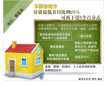 ??? 央行網(wǎng)站2日頒布《關(guān)于調(diào)整個人住房貸款政策有關(guān)問題的通知》,指出在不實施“限購”措施的城市,居民家庭首次購買普通住房的商業(yè)性個人住房貸款,原則上最低首付款比例為25%,各地可向下浮動5個百分點。對擁有1套住房且相應(yīng)購房貸款未結(jié)清的居民家庭,為改善居住條件再次申請商業(yè)性個人住房貸款購買普通住房,最低首付款比例調(diào)整為不低于30%。