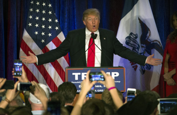 2月1日,美國共和黨總統(tǒng)候選人唐納德·特朗普在美國艾奧瓦州錫達拉皮茲參加競選活動。美國中西部的艾奧瓦州1日晚舉行2016年總統(tǒng)選舉首場黨內預選,打響今年美國總統(tǒng)大選的第一槍。 新華社/歐新中文? |