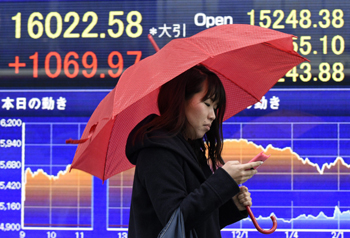 2月15日,一名女子在日本東京經(jīng)過一塊股指顯示屏。受上周末歐美股市大漲、國際油價上升、日元貶值及投資者逢低買入操作等多重利好因素刺激,東京股市日經(jīng)225種股票平均價格指數(shù)15日飆升千余點至16000點關(guān)口以上,漲幅達7.16%?!⌒氯A社/歐新中文? |