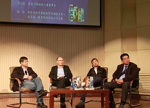 參會嘉賓有教育部長江學(xué)者特聘教授陳勁、優(yōu)客工場創(chuàng)始人兼董事長毛大慶、北京大學(xué)新聞與傳播學(xué)院教授胡泳和北京創(chuàng)一教育科技有限公司總裁徐中。