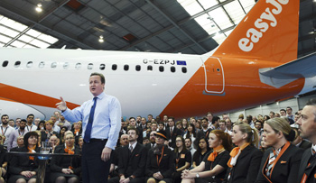 5月24日,英國首相卡梅倫在倫敦北部盧頓的易捷航空公司總部發(fā)表講話。 卡梅倫當(dāng)日說,如果在下月舉行的公投中選擇脫離歐盟,英國家庭去歐洲其他國家的旅行花費(fèi)平均水平將會上升。這是卡梅倫近期一系列警告脫歐將沖擊英國家庭經(jīng)濟(jì)狀況的最新表態(tài)。 新華社/路透? |