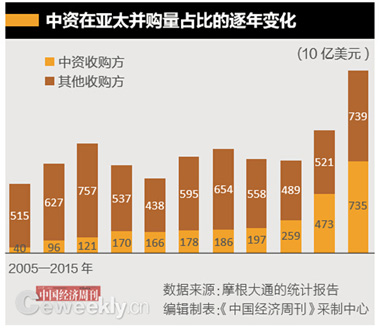 摩根大通報告顯示,亞太地區(qū)2015年的并購總量為1.5萬億美元,其中中國企業(yè)發(fā)起的并購交易量為7350億美元,較2013年增長近兩倍;兩年時間里,中國在整個亞太地區(qū)并購交易量中的占比從35%增長到50%。