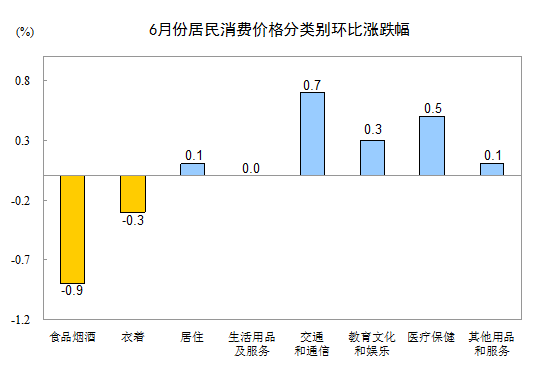 6月份,全國居民消費價格總水平環(huán)比下降0.1%。其中,城市下降0.1%,農村下降0.1%;食品價格下降1.4%,非食品價格上漲0.2%;消費品價格下降0.4%,服務價格上漲0.3%。