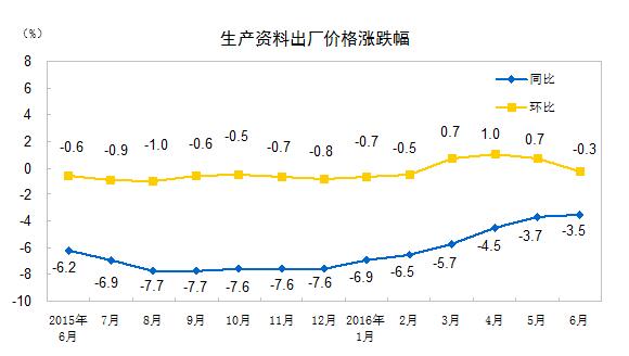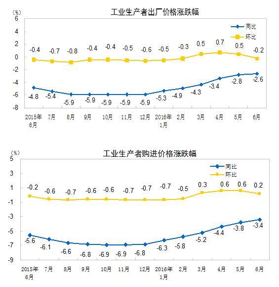 2016年6月份,全國工業(yè)生產(chǎn)者出廠價格環(huán)比下降0.2%,同比下降2.6%。工業(yè)生產(chǎn)者購進價格環(huán)比上漲0.2%,同比下降3.4%。上半年,工業(yè)生產(chǎn)者出廠價格同比下降3.9%,工業(yè)生產(chǎn)者購進價格同比下降4.8%。