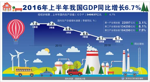 國家統(tǒng)計局日前公布的上半年國民經(jīng)濟運行數(shù)據(jù)顯示,上半年國內(nèi)生產(chǎn)總值初步核算為340637億元,按可比價格計算,同比增長6.7%。分季度看,一季度同比增長6.7%,二季度增長6.7%。專家表示,上半年供給側(cè)結(jié)構(gòu)性改革成效初顯,中國經(jīng)濟穩(wěn)中趨好亮點不斷。下半年,經(jīng)濟運行依然面臨內(nèi)外部多方面不確定性,下行壓力仍然較大。政府在財政政策和貨幣政策上保持穩(wěn)中求進的總基調(diào),深入實施簡政放權(quán)減稅清費和創(chuàng)新驅(qū)動發(fā)展戰(zhàn)略等五大宏觀政策,預(yù)計未來國民經(jīng)濟將保持平穩(wěn)運行。