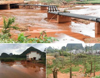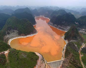 ?這是記者近日航拍的廣西華銀鋁業(yè)有限公司龍山排泥庫。該庫庫容2293萬立方米,相當(dāng)于40多個(gè)北京北海的容量。尾礦庫長期堆存于青山間,不僅污染著生態(tài),更在2008年至2012年的4年間,先后發(fā)生9次泄漏,靖西境內(nèi)眾多村民房屋被淹,大量農(nóng)田被毀。記者 周華/攝 |