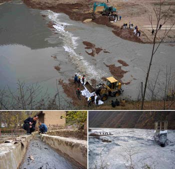 ?這是記者拍攝的甘肅省隴南市西和縣隴星銻業(yè)公司尾礦庫泄漏事故救援現(xiàn)場。流經(jīng)西和縣的太石河因尾礦泄漏成了環(huán)保事件中有名的“水泥河”。 2015年11月,隴星銻業(yè)公司尾礦庫二號(hào)溢流井隔板破損出現(xiàn)漏沙約3000立方米,經(jīng)太石河流入西漢水,造成涉及甘肅、陜西、四川三省的重大突發(fā)環(huán)境事件。記者 黃文新/攝 ? |
