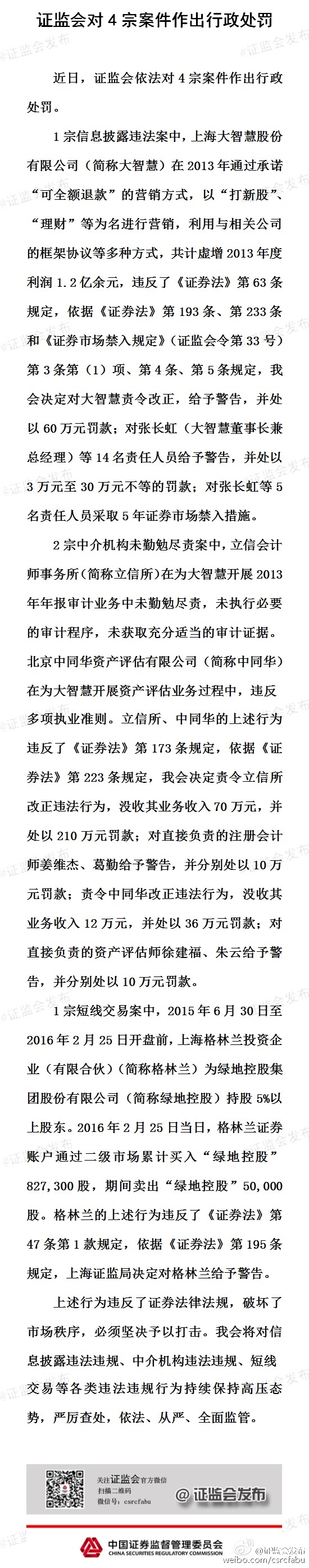 其中,1宗信息披露案為上海大智慧披露違法案,證監(jiān)會決定對大智慧責(zé)令整改、處以警告,并處60萬元罰款,對14名相關(guān)責(zé)任人給予警告并處3萬到30萬元不等的罰款。