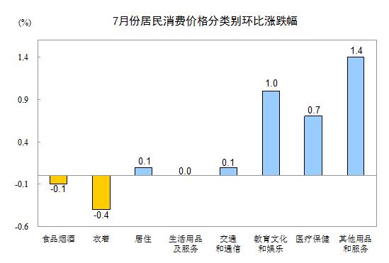 7月份,全國居民消費價格總水平環(huán)比上漲0.2%。其中,城市上漲0.3%,農(nóng)村持平;食品價格下降0.2%,非食品價格上漲0.3%;消費品價格下降0.1%,服務(wù)價格上漲0.6%。