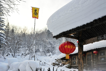 雪鄉(xiāng)的雪美得奇特,美得讓人不敢相信,真像童話故事和畫片中所描述的那樣,厚厚的白雪覆蓋的小村子連綿起伏,涌起像蘑菇一樣的座座小房子,在房頂和拌子垛上卷起一層層雪檐,她們就像剛長出來的一株株矮矮胖胖的“雪蘑菇”,慵懶而立。老房子外面的小院都是用木柵欄圍起來的,線條簡潔而不規(guī)范,如同炭筆畫漫不經(jīng)心的勾勒。當柵欄的木枝披上銀色外衣之后,則酷似一根根即將融化的奶油冰棍,與中間的“蛋糕”相映成趣。房頂、大地、山上隆起的雪堆和線條柔潤如棉絮,潔白像陶塑銀雕,在陽光映照下變幻萬千,韻味無窮。家家戶戶貼滿五顏六色的掛線春聯(lián),掛起串串紅燈,把那素雅的銀裝世界裝點映襯得更加美麗生動。