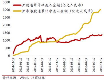 深港通首日波瀾不驚,成交量整體較為有限。業(yè)內(nèi)較為關心的,則是開通之后南北資金的流向問題。公開資料顯示,自2014年11月17日滬港通開通之后,滬股通資金流入情況經(jīng)過了三個階段。開通之初資金明顯流入,2015年7月3日達到最高點,隨后資金明顯流出,2016年2月25日達到最低點;此后資金又逐漸緩慢回流,目前累計資金凈流入接近1400億元人民幣,占滬股通總額度的比例不足一半;滬市港股通則一直處于流入的態(tài)勢,至2016年11月中期達3000億元人民幣左右。