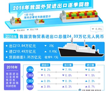 海關總署新聞發(fā)言人黃頌平表示,2016年全球經(jīng)濟仍處于國際金融危機后的深度調(diào)整期,經(jīng)濟復蘇乏力,國際市場需求疲弱,我國對外貿(mào)易發(fā)展面臨的不確定因素明顯增多,下行壓力加大,總體形勢復雜嚴峻。隨著國家促進外貿(mào)回穩(wěn)向好政策措施效果的逐步顯現(xiàn),一季度我國外貿(mào)進出口值明顯下降,二季度出現(xiàn)企穩(wěn),三四季度持續(xù)實現(xiàn)正增長,全年呈現(xiàn)前低后高、穩(wěn)中向好的走勢。