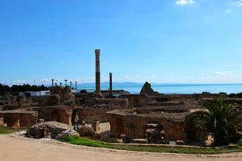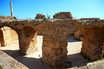 迦太基古城羅馬時(shí)代的遺跡殘存較多。羅馬人在比爾薩山上建有大神廟,露天柱廊上則保存有羅馬在迦太基最杰出的勝利神和豐收神的雕像。著名的公共浴場(chǎng)則是在公元145年-162年間羅馬皇帝安東尼時(shí)期建成的,是古羅馬的第四大浴場(chǎng)。從基部殘存的柱石、斷墻、拱門可隱約看出兩邊對(duì)稱排列的一間間浴室,浴室有更衣室、冷水室、溫水室、蒸汽浴室、按摩室、健身房等。浴場(chǎng)用水則從遠(yuǎn)處的山泉通過60公里長的引水渡槽引來。渡槽高6米-20米,至今仍遺存數(shù)段渡槽和支架。